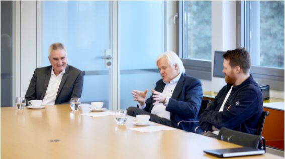 Hans Beckhoff(中間)和 Martin Rostan(左)回顧 EtherCAT 技術過去 20 年的發展歷程并與代表下一代管理層的 Johannes Beckhoff(右)分享了他們多年積累的經驗
