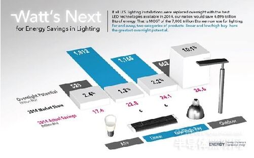 據悉,美國能源署(DOE)近日發(fā)布了一份題為《LED在普通照明應用中的使用》的報告。這項報告不僅估算了2014年LED在10大照明應用中的節(jié)能效果,還預估了這些照明應用完全采用LED產品的節(jié)能潛力。 據報告顯示,由于LED光源的采用,2014年節(jié)約能源為143萬億英熱單位(相當于節(jié)省成本約14億美元),但如果所有應用中的通宵照明產品都換成LED光源,將節(jié)約近4,896萬億英熱單位(相當于節(jié)省成本490億美元)。 2012-2014,LED在所有應用中的安裝量增加,整體增幅超過四倍至215萬,但市場滲透率仍然不大,攀升至3%。小型定向LED光源仍然是市場份額的領先者,從2012年的10%增加到2014年的22%,增長或在未來幾年放緩。2014年,LED光源占戶外應用市場份額為10%,占室內應用市場份額為2.8%。